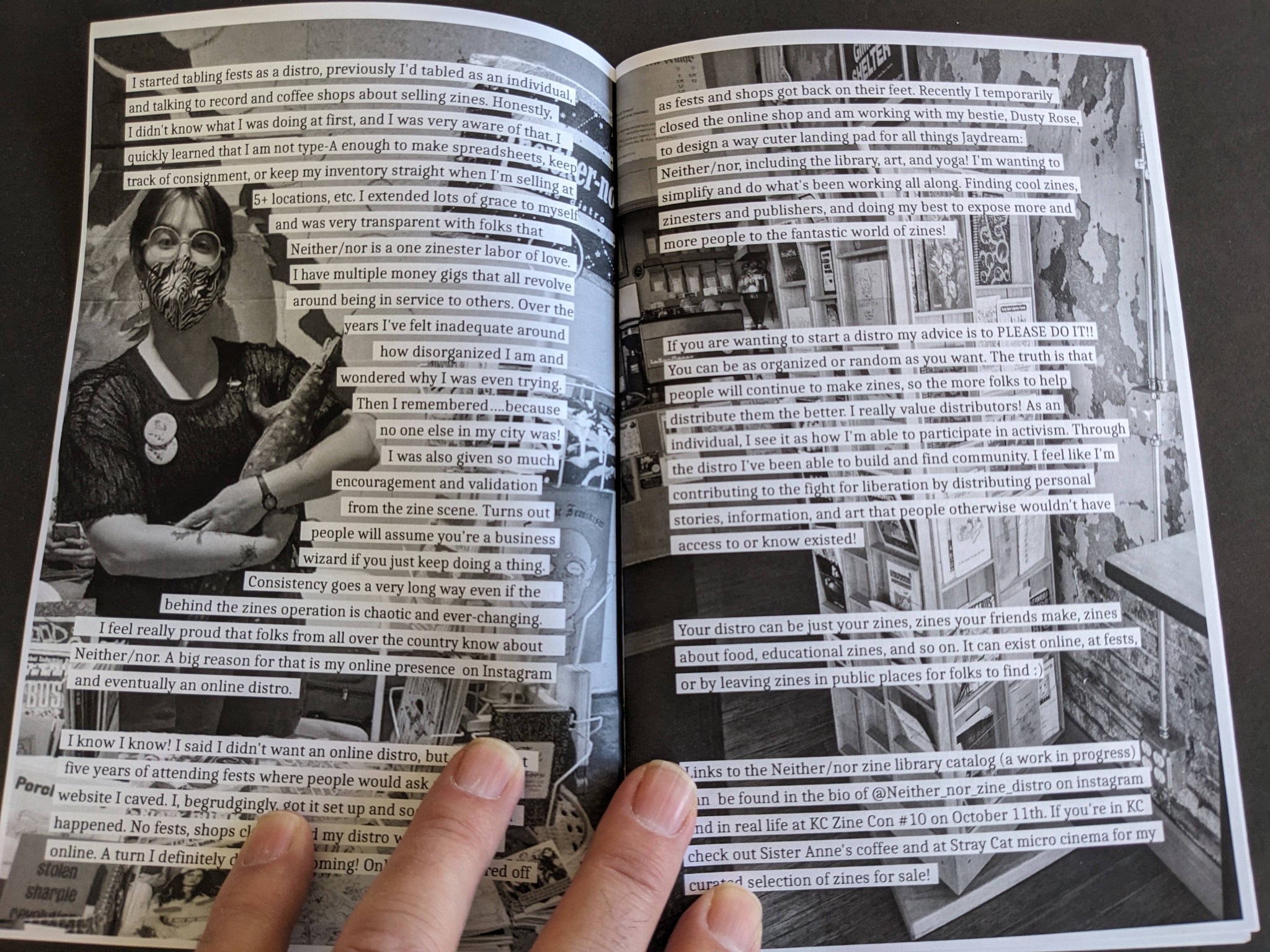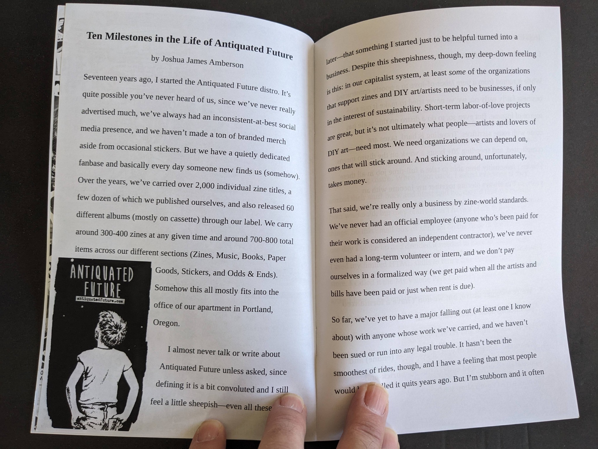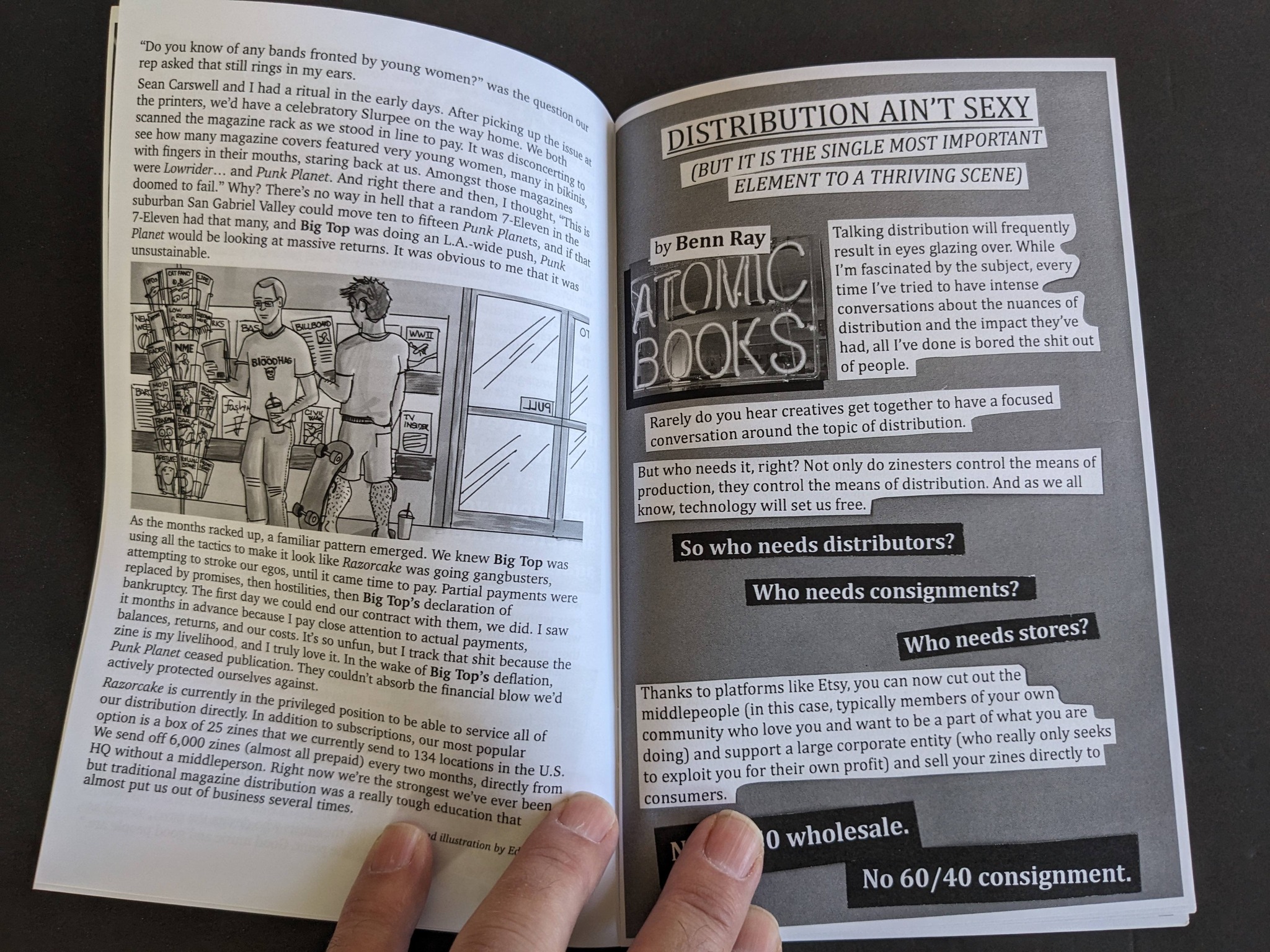 Behind the Zines is subtitled “A Zine About Zines,” and this great issue takes on the subject of zine distribution. Includes articles by Ed Kemp of The Word Distribution, Jaydream of Neither/Nor Distro, Local Microdistros by August Personage, Todd (Razorcake) Taylor on the history of 90s zine distribution (a sordid tale!), Benn Ray of Atomic Books with advice for zine makers from a retailer’s perspective, Joshu James on the up and down history of Antiquated Future, and lots more! If you are involved in the zine/comix subculture, you’ll find lots to dig in this great issue. 44 digest pages, black and white throughout in a classic cut and paste layout. (BTZ)