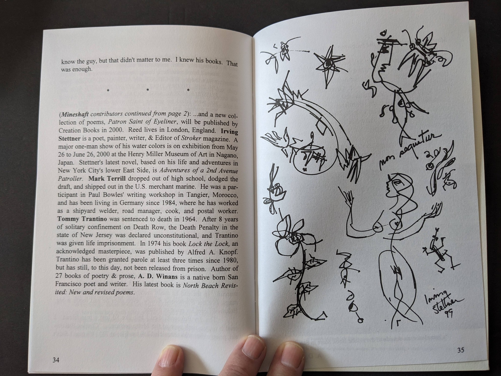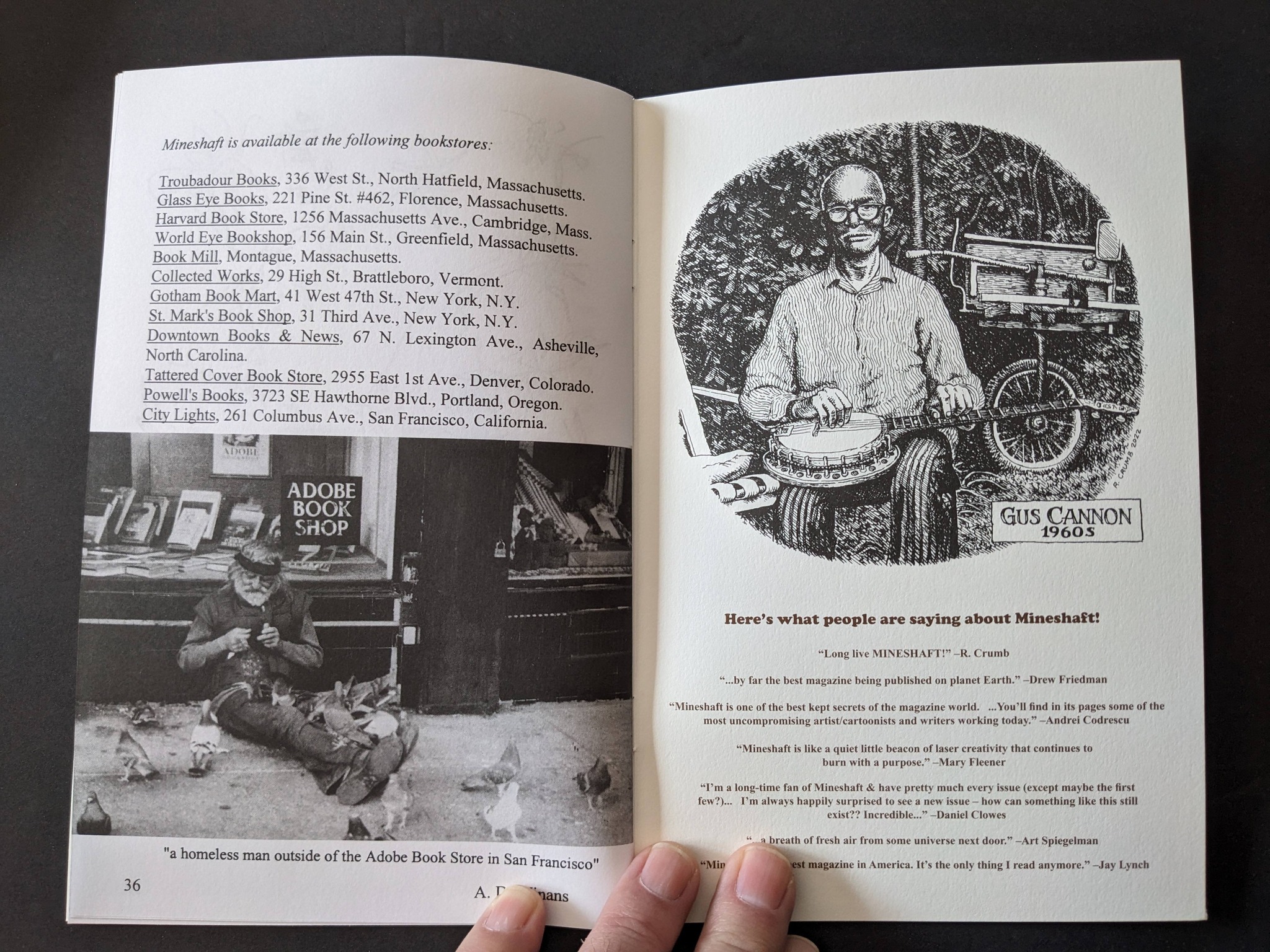This is “a special revised edition of Mineshaft #4, long out-of-print and very hard to find, featuring Charles Bukowski, a beautiful new logo & cover lettering by Christoph Mueller, and a new drawing of banjo player Gus Cannon by R. Crumb, is now available! This is the issue of Mineshaft that I first sent to R. Crumb, more than 25 years ago, asking him if he would consider contributing to Mineshaft. He responded with a letter and 20 sketchbook pages, and he’s been contributing ever since. Features the classic poem by Charles Bukowski, “the tragedy of the leaves” to go along with an editorial tribute, “The Day Bukowski Died.” Also in #4 are stories from Tommy Trantino and Karl Orend (Orend wrote an essay about his boyhood growing up in Transylvania), plus poetry by Jeremy Reed, Catherine Aldington, Mark Terrill, Irving Stettner, A.D. Winans & more!” ed. Ev Rand. 36 digest pages, black and white throughout. Only 300 copies printed! (Mineshaft) [(Mostly) NOT COMICS]