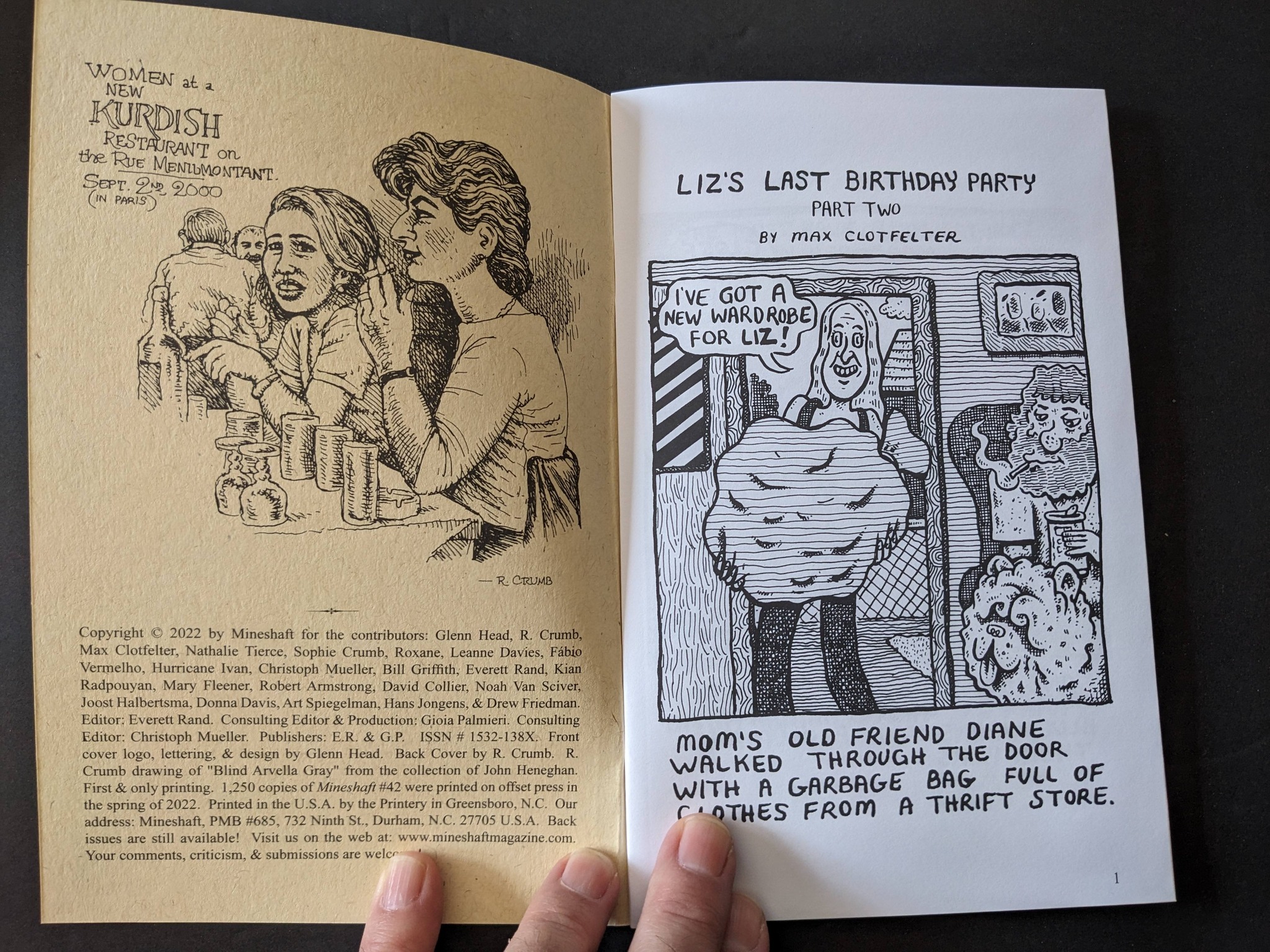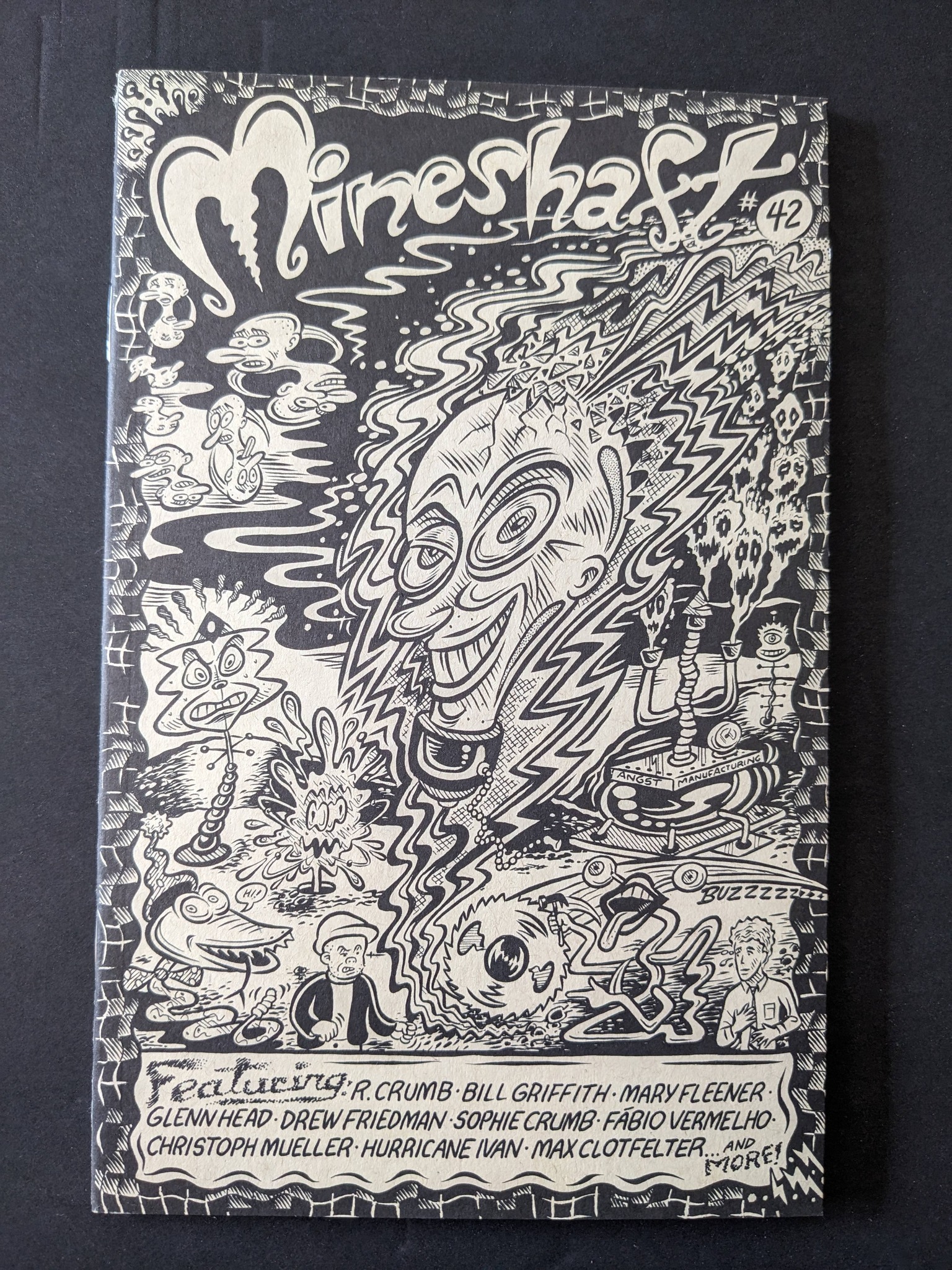 #42: Featuring explosive “Angst Machine” cover art by Glenn Head & “3 Bears” back cover by R. Crumb, and packed with exciting new work from Glenn Head, R. Crumb, Sophie Crumb, Bill Griffith, Christoph Mueller, Fabio Vermelho, Drew Friedman, Max Clotfelter, Kian Radpouyan, Nathalie Tierce, Leanne Davies, Hurricane Ivan, Mary Fleener, Robert Armstrong, Joost Halbertsma, …PLUS letters from R. Crumb, David Collier, Bill Griffith, Robt. Armstrong, Nathalie Tierce, Noah Van Sciver, Art Spiegelman, & MORE! 60 digest pages, black and white with some spot color. (Mineshaft)