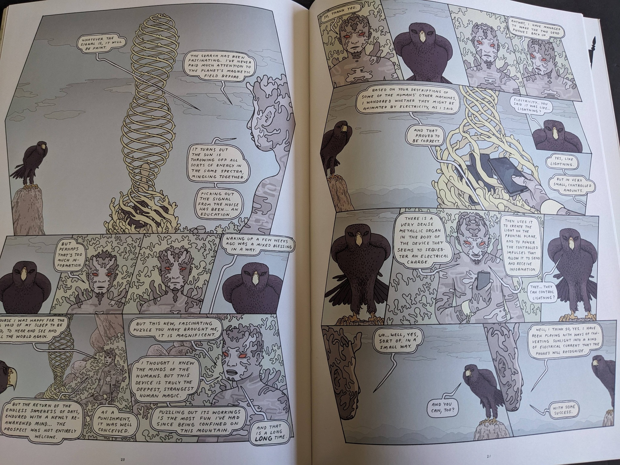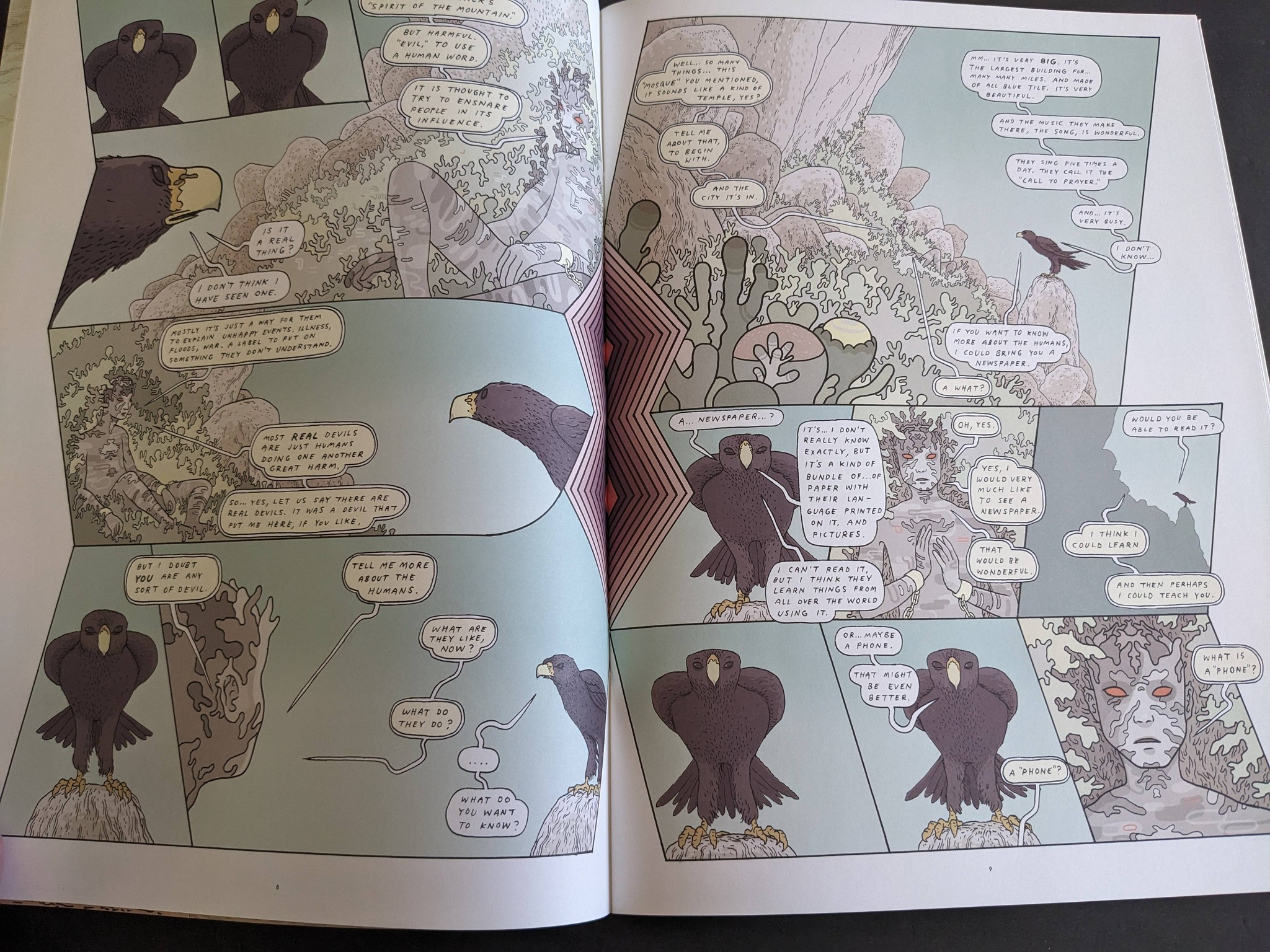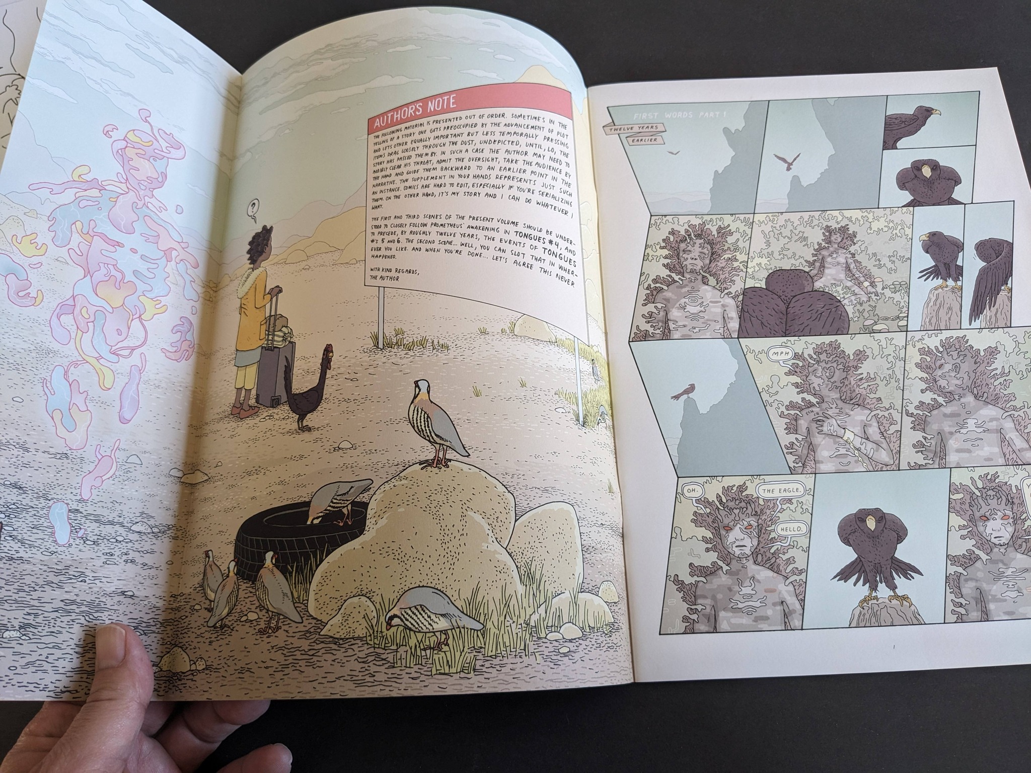 This gorgeous book includes material that can/should be inserted into places into previously published sections of Nilsen’s ongoing epic, Tongues. A self-deprecating author’s note explains how. 36 full color pages, gorgeous, 9″ x 12.25″, French flaps. (No Miracles Press)